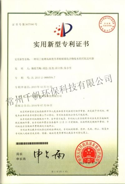 實(shí)用新型專利證書 一種用于處理高濃度芳香族硝基化合物廢水的厭氧反應(yīng)器
