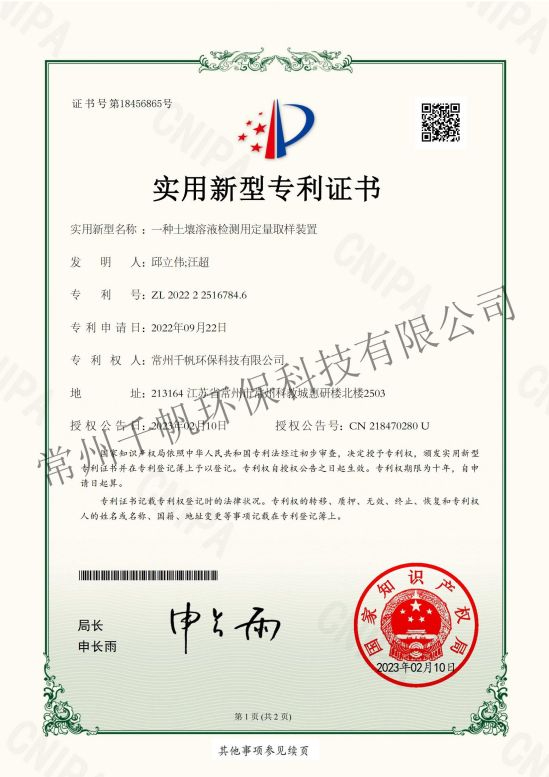 實(shí)用新型專利證書 一種土壤溶液檢測(cè)用定量取樣裝置